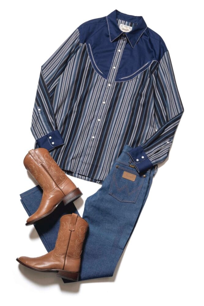 ウエスタンシャツとジーンズという王道の組み合わせ。ポケットのデザインやヨークなど、まさに“ウエスタン”なシャツは、アメリカ企画の「ラングラー」。ジーンズはブーツカットでももちろん良いが、ストレートでもなんら問題はない。映画『タクシードライバー』のロバート・デニーロもストレートのデニムにウエスタンブーツを合わせていた。トップスとパンツが落ち着いたカラーであるため、ブーツはブラウンがベターだ。