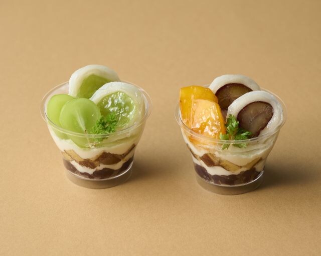 一心堂「シャインマスカット大福とふわどらのパフェ」「モンブラン大福と柿とふわどらのパフェ」(1個/各692円)【阪急うめだ本店初登場】