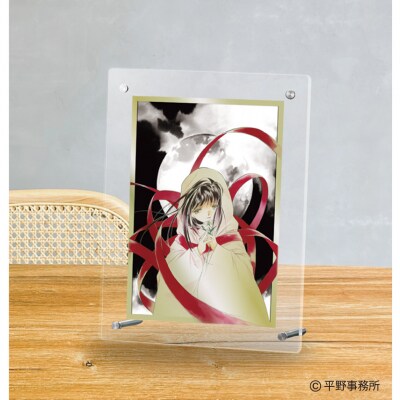 原画の黄色い月を、鏡面を活かすモノクロへ再構成することで、生と死を表現するような銀の月となりました。通常、原画の色味変更は難しいところ、垣野内成美先生のご厚意により、鏡の冷たい銀、真鍮のほのかな金、そして原画の鮮やかな色彩、この三色の調和が実現。繊細な輝きは、夕維の運命を感じさせる美しさです。