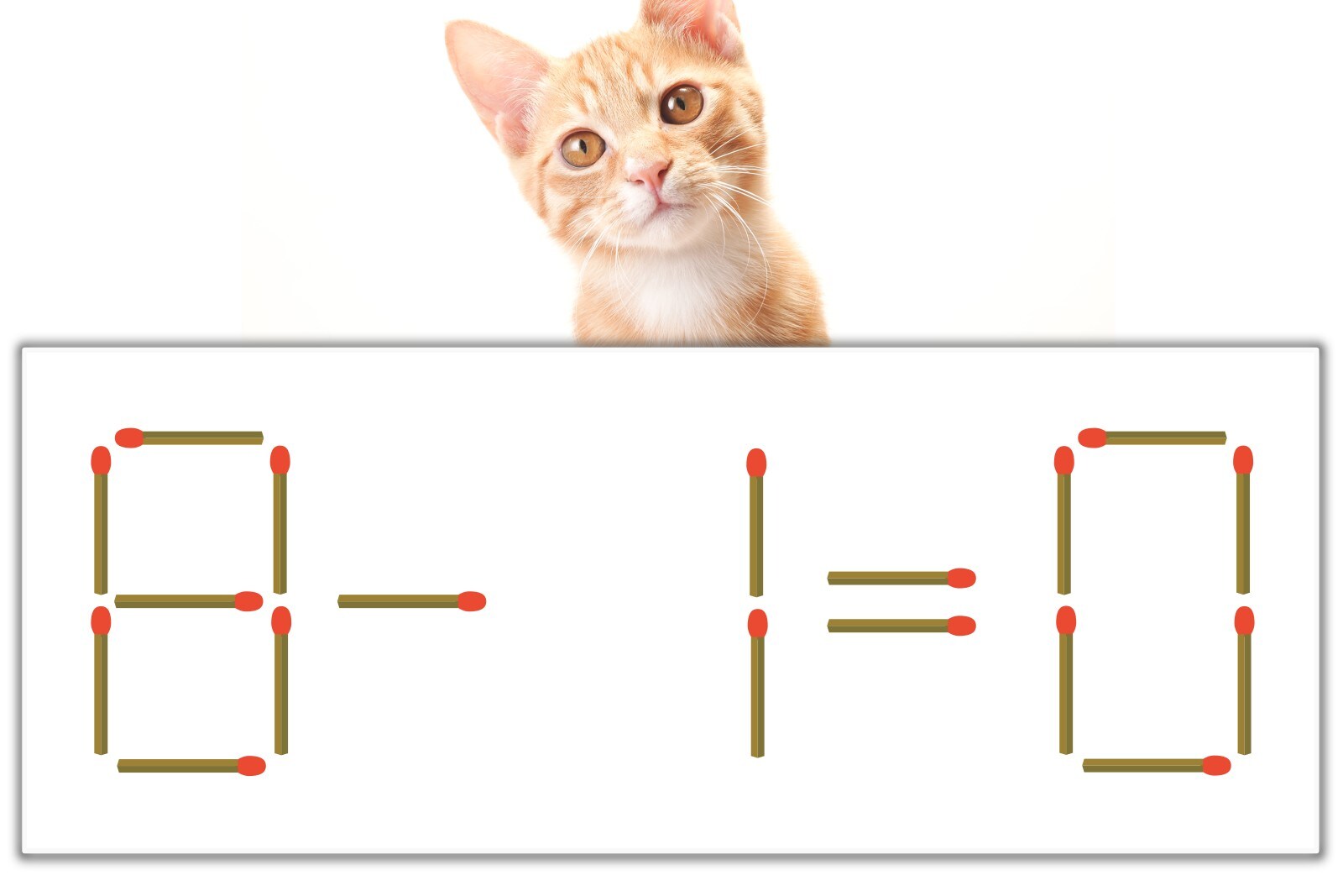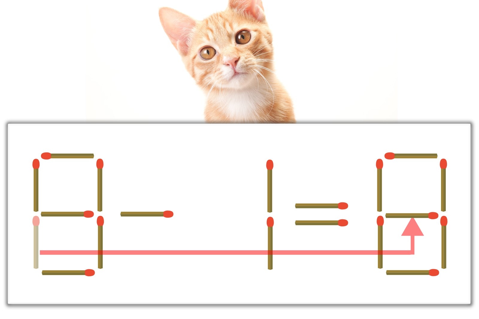 「8」のマッチ棒を1本、右にスライドさせて答えで「8」を作り、「9-1=8」にする。※解答は複数ある場合があります。