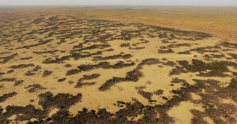 バンナや荒れ地を空から眺めると、緑の点々がぽつぽつと散らばり、まるでバラバラに生えているように見えます。