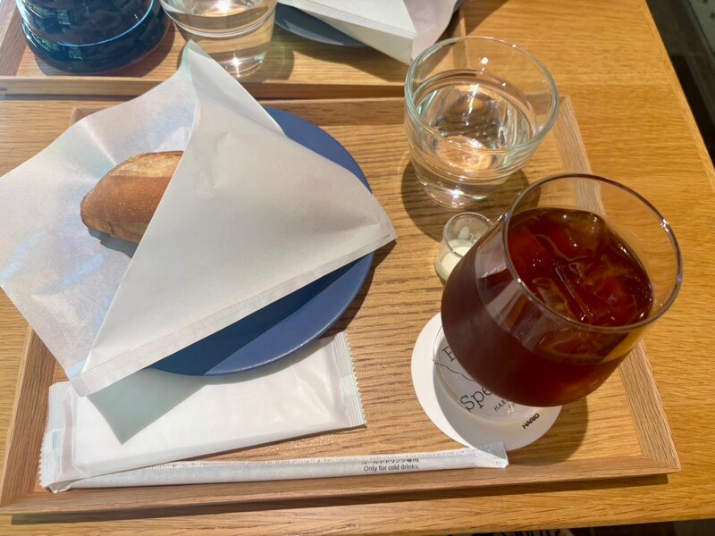 お腹が空いたので、水出しコーヒーとハムチーズサンドを注文。この日はよく晴れていて、木漏れ日を感じながらランチができるとても素敵な場所でした。