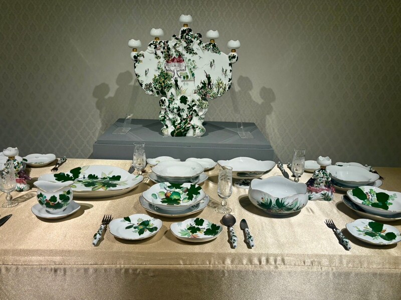 写真撮影NGゾーンだったのでぜひ現地にて観ていただきたいのですが、《アラビアンナイト》 コーヒーサービスでは12種類すべての柄が揃って展示されており圧巻。細かく繊細で美しい絵はもちろん、お皿の裏がちらりとみえると黄金だったりお皿が重なっている部分にも細やかなデザインがされていたりと近くで見られるからこその発見があり、心がときめきました。
