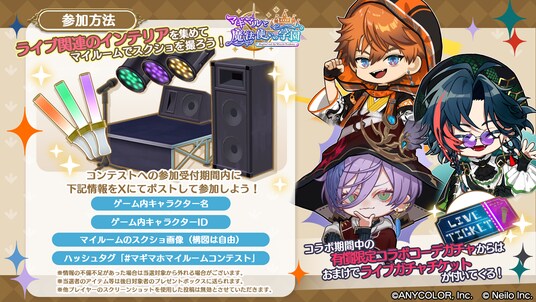 11月3日(月/祝)スタート!ペンライトやステージライト、スモークやステレオを入手しよう!ライブ会場を盛り上げるライブガチャが登場。たくさんのアイテムでお部屋をカスタマイズして、『マギマルと魔法使いの学園』公式Xのスクショコンテスト「ライブ会場をプロデュース」にも是非ご参加ください。
