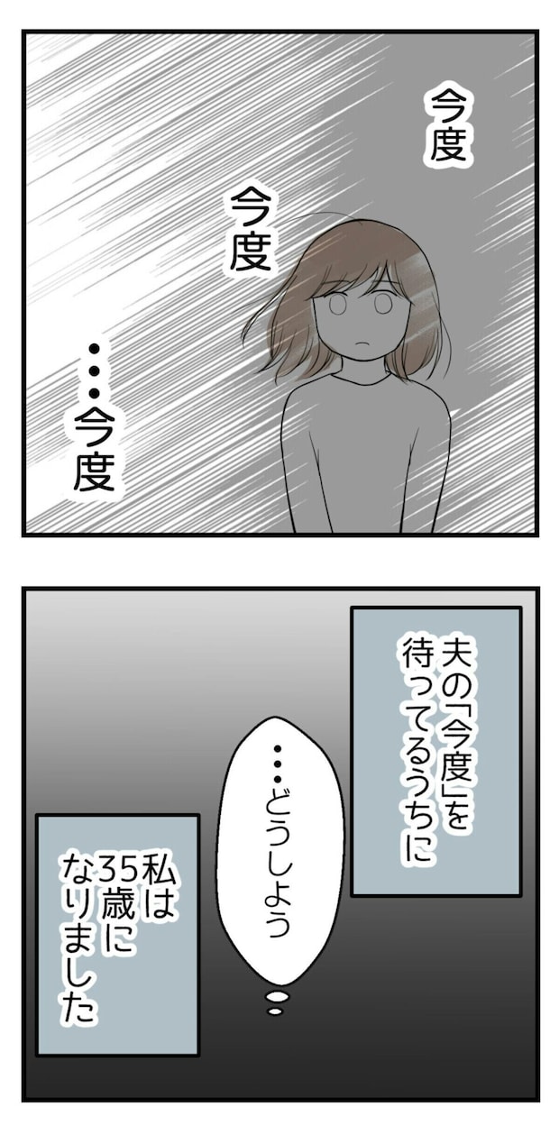 子どもがほしいと思っている主人公。体を整えたり、夫にそれとなく話をしてみたりと、努力を続けていました。しかし、夫にズルズルと話を先延ばしにされてしまい、気づいたら35歳になっていました。