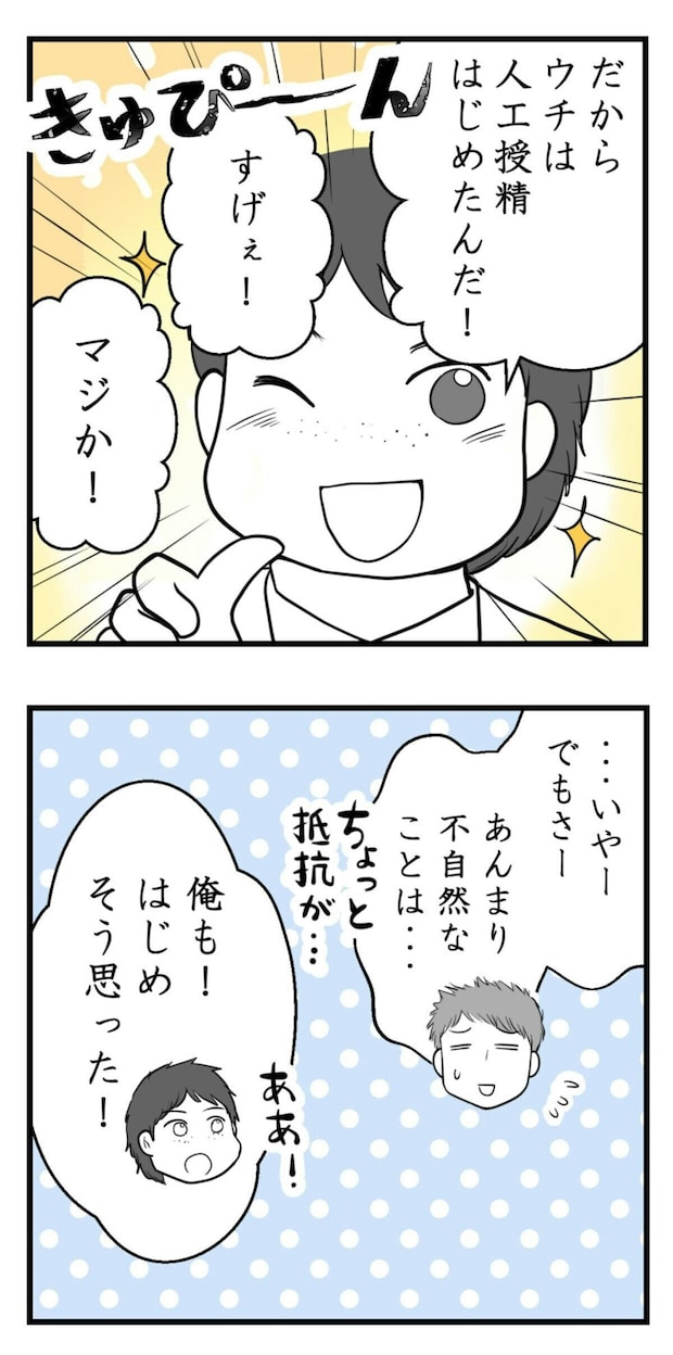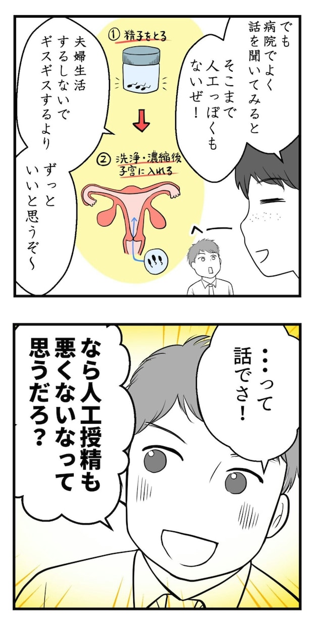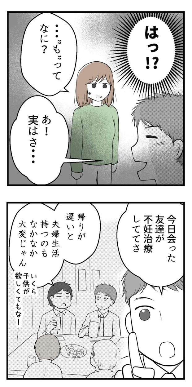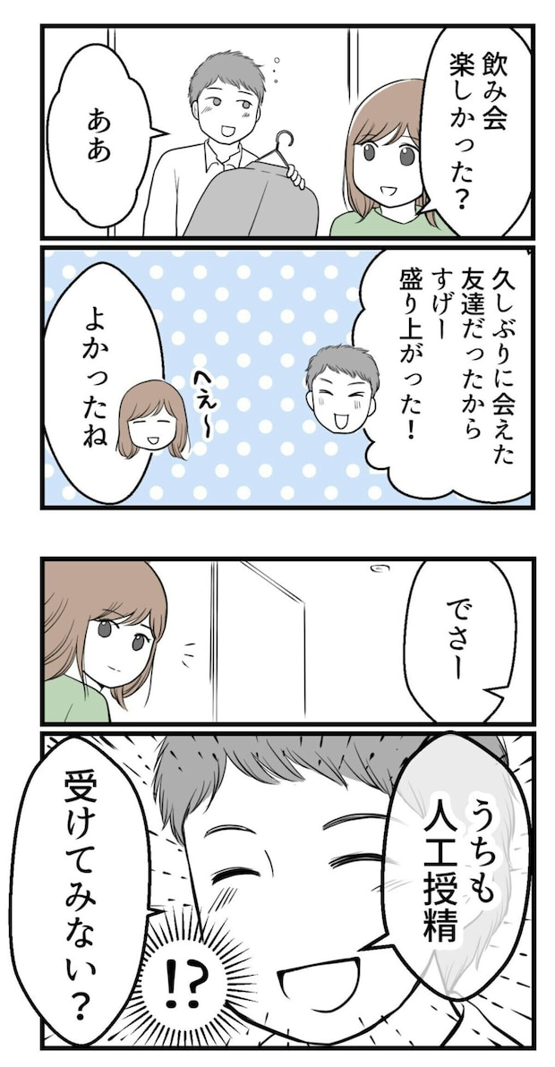 主人公が妊娠を諦めた矢先。夫から「人工授精を受けてみないか」と突然提案されます。今まで散々、妊活の話も人工授精の話も、主人公はしてきたのに…。妻ではなく、友人からの話は聞くなんて…とショックを受けます。