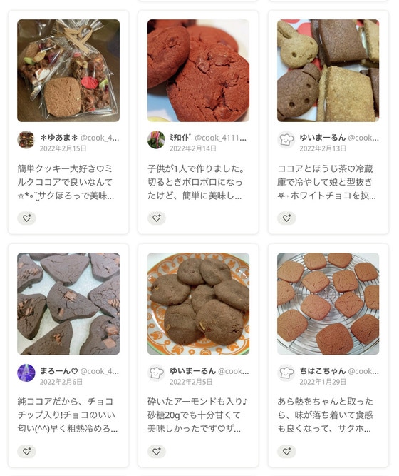 ナッツやチョコチップを入れたり、型抜きしたりとさまざまなアレンジつくれぽも投稿されていて、みなさんがクッキー作りを楽しむ様子が伝わってきます。バレンタインに作ったというつくれぽもありましたよ。今年のバレンタインには殿堂入りレシピで、おいしいクッキーを作ってプレゼントしてみませんか。