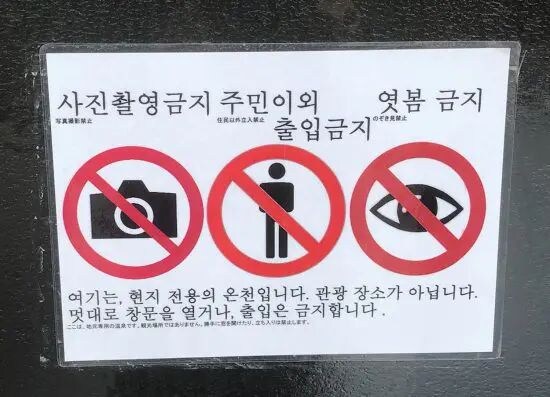 某温泉宿の韓国語による注意書き。住民用の温泉に勝手に出入りしたり、無断撮影、のぞき行為を禁じている一部の観光客のせいで特定の国籍が出禁になった事例も。九州の温泉宿の経営者は、次のように話す。