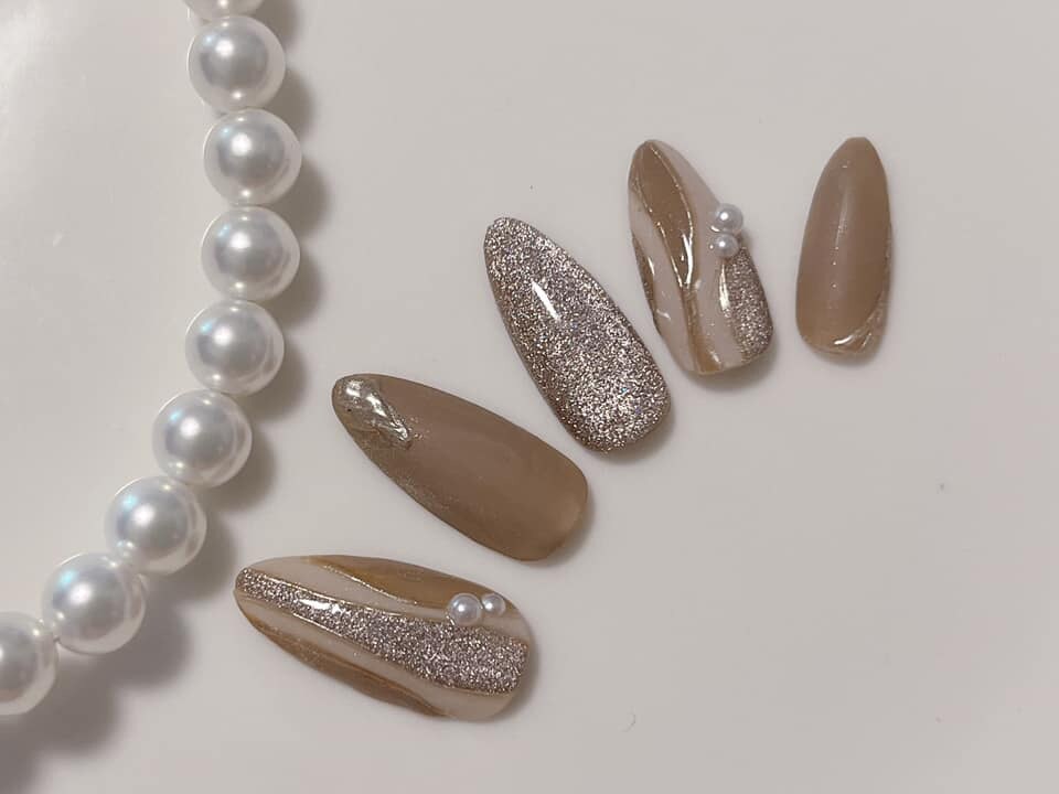 色味を秋らしいカラーで控えめにしつつ、マグネットネイルでお祝いにふさわしいキラキラ感をワンポイントで入れ込みました。