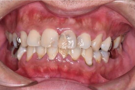 30代男性。歯石などの汚れが付着して歯茎が炎症している。むし歯もみられる定期的な歯科検診: