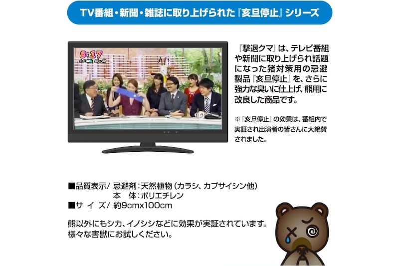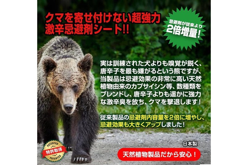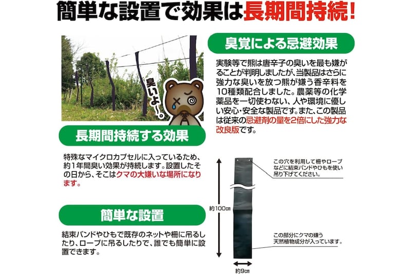 従来の製品よりも忌避成分を2倍に増量し、強烈な臭いでクマを寄せつけない仕組みになっています。