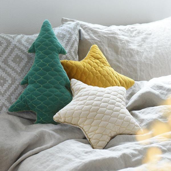 ふわっと起毛したベルベットコットンのキルティング素材を使った小さなクッション。ツリーやお星さまなどクリスマスをイメージしたフォルムで作られています。