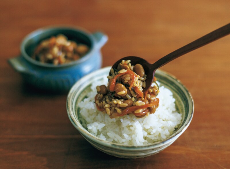 1. 米麹はもんでパラパラにしておく。納豆はパックから取り出し混ぜておく。糸昆布は水でもどしておく。にんじんは千切りにする。