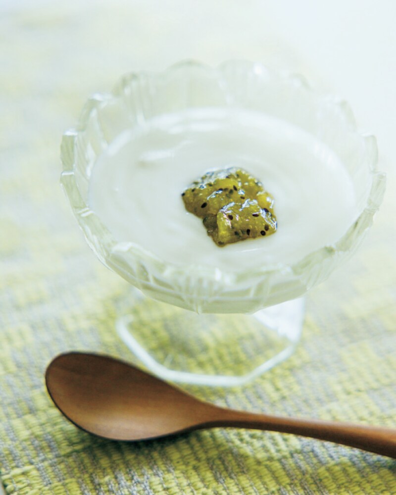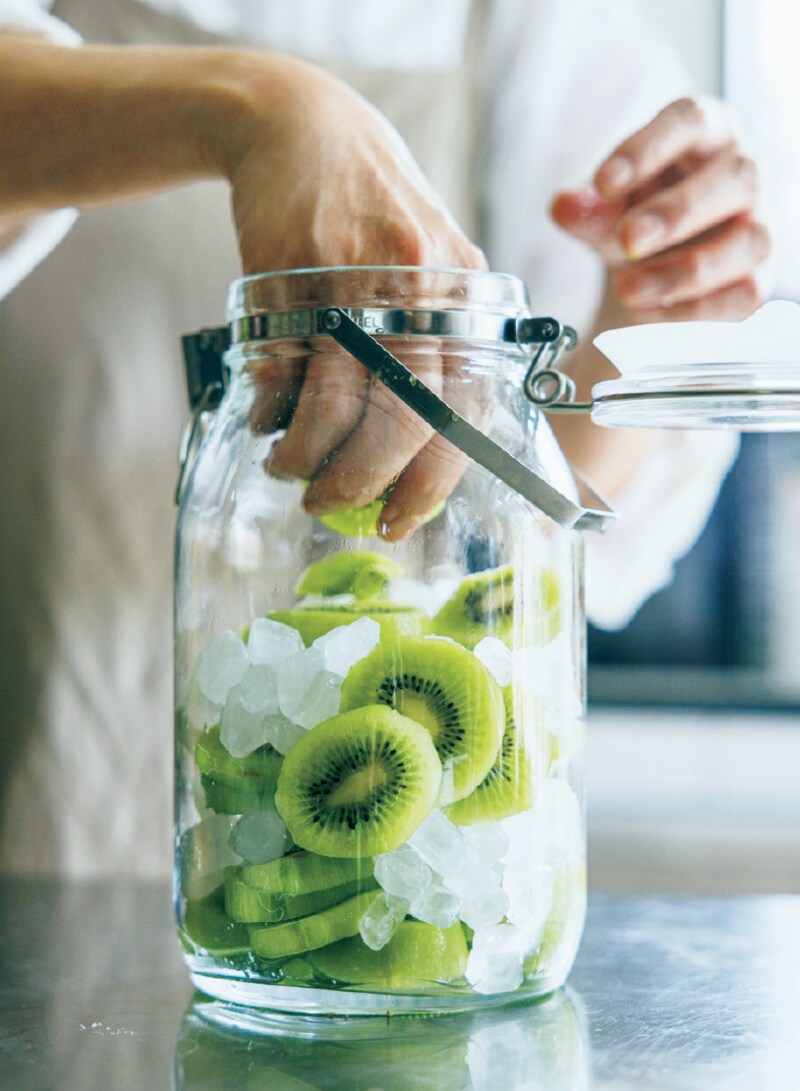 4. 瓶の口ぎりぎりまで詰めたらふたをする。冷暗所で保存し、1日1 回、瓶を揺する。1ヵ月ほどで完成したら、キウイはとり除き、別の保存容器に移しておく。