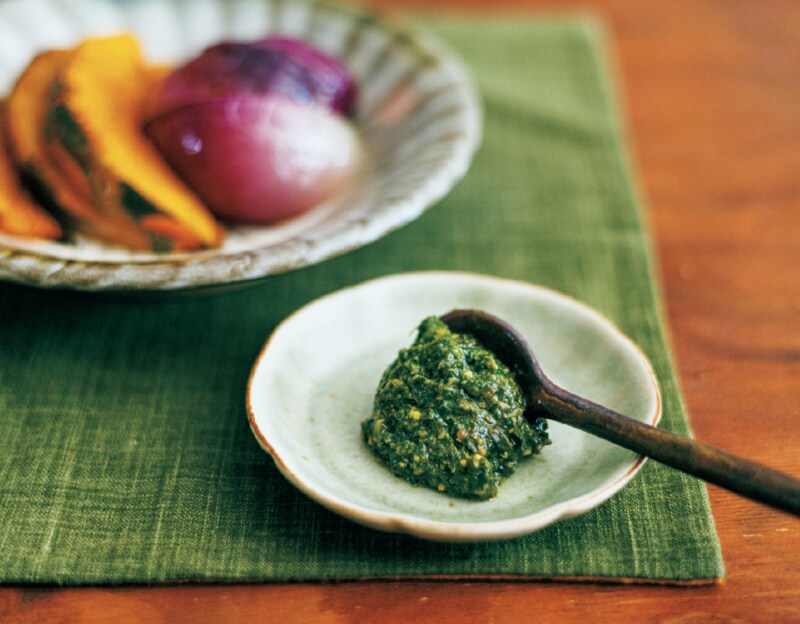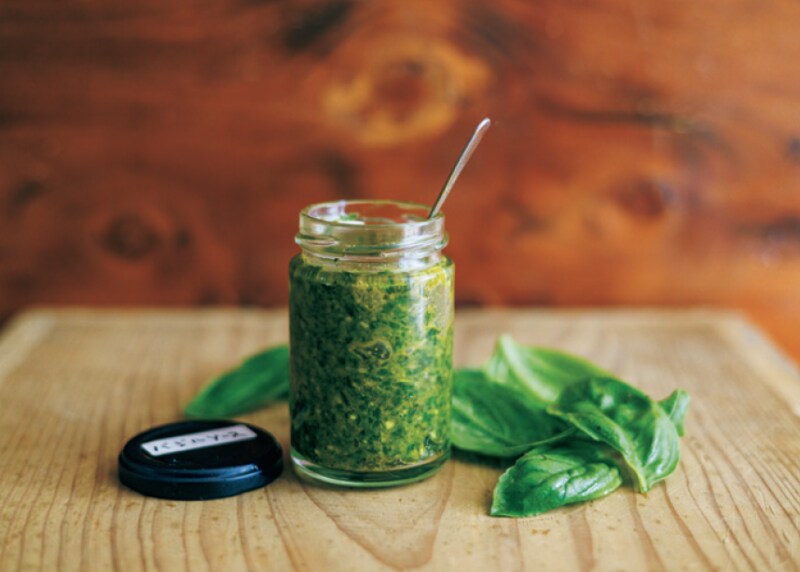 4. 保存容器に3 のバジルソースを入れ、冷蔵庫で保存する。バジルソースは空気に触れると変色しやすいため、表面をラップなどで覆っておくとよい。