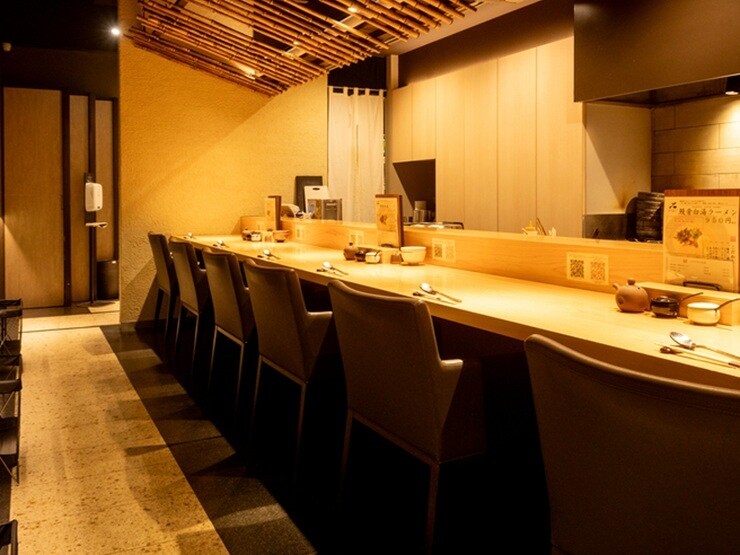 和の風情漂う落ち着いた雰囲気の店内。ゆったりと配置されたカウンター席では、料理人の手さばきを間近で楽しみながら食事ができます。半個室と個室も備えられており、プライベート感を求めるファミリーやグループにも対応。営業はランチタイムのみで、鰻をつまみに一人で昼飲みという利用の仕方もオススメです。