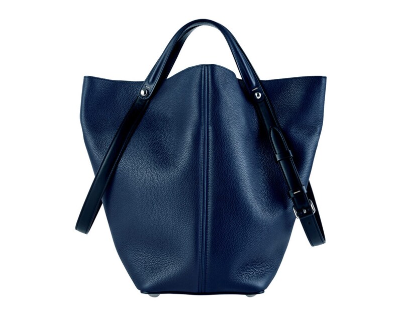 〈メゾン マルジェラ〉のアイコンバッグ「ドレサージュ」は、ハンドルとストラップが付いていて、複数の持ち方が楽しめる優れもの。内側に付いているマグネットの留め方次第で、シルエットを変化させることもできる。新色のネイビーは、柔らかなカーフスキンの風合いと相まり、端正な雰囲気を醸し出す。