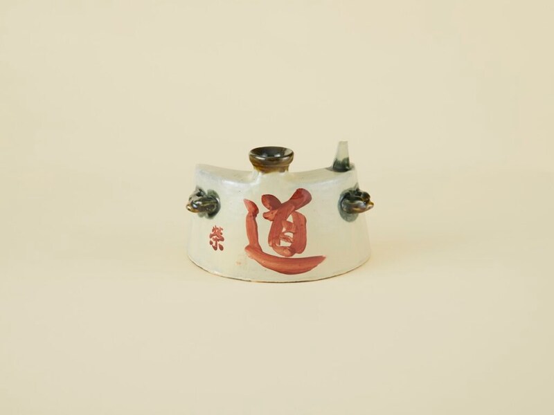 沖縄の酒器である「抱瓶(だちびん)」に、赤絵で「道」と書かれたものは、人間国宝として知られる安部榮四郎の作品。彼は出雲民藝紙の創設者でもあり、生涯を通して書の作品を多く残していました。この抱瓶は彼が沖縄に渡って製作したもので、筆で文字が力強く書かれています。その赤は酒を入れる口の鉄釉の茶、左右にある紐を掛ける部分の緑釉の緑と相性が良く、沖縄のおおらかさと品が相まってなんとも言えない雰囲気が漂います。ただ飾るだけではなく、ここはちょっと贅沢に、酒器として使っていきたいです。