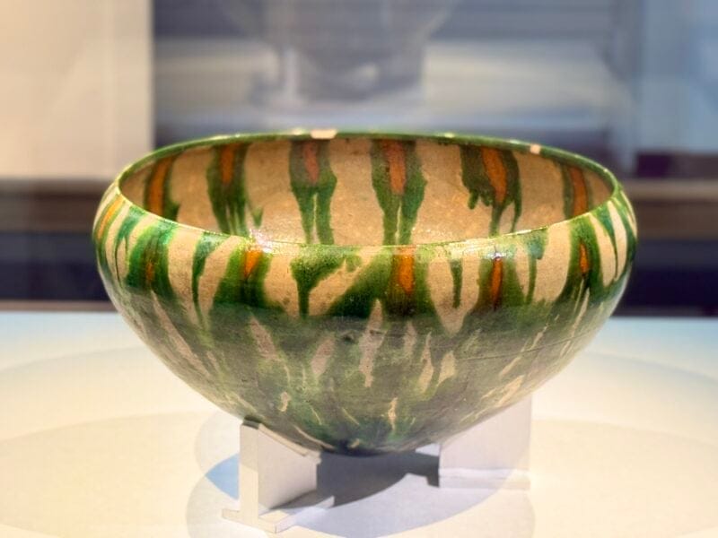 古代中国の唐でさかんに作られた陶器「唐三彩(とうさんさい)」のように見える、南倉9「磁鉢(じはち)」。でも、なんと日本で作られた「奈良三彩」なのだそう!
