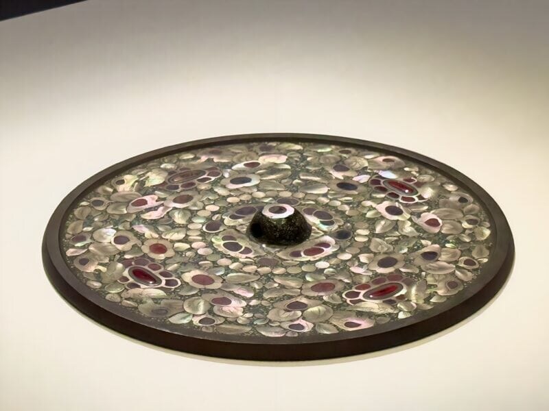 日本では手に入らない、シルクロードの各地で産出された素材を使って花や鳥のモチーフが表現されています。大きな花の中心の赤い部分だけがぷくっと立体的で、この鏡を作った遠い昔の人のセンスを感じられます。