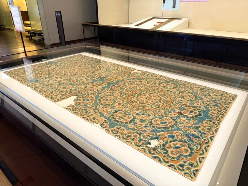 近くにいた学芸員さんに「これ、本物ですか?」と思わず確認してしまったのが、南倉150「赤地錦几褥(あかじにしきのきじょく)」。仏さまへの供物を載せる机に敷いて使われた、机の上敷きだそうです。びっくりするほど保存状態がよく、色鮮やか。