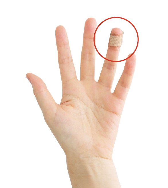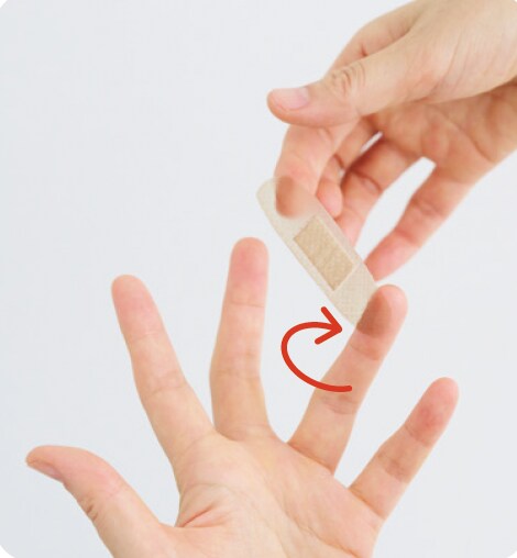 絆創膏を横に持ち、端を薬指の先端の腹に合わせて貼ります。