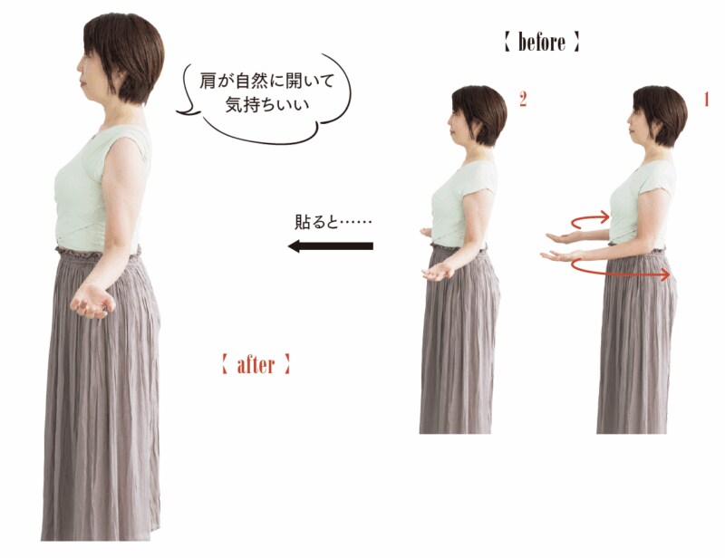 外向きに貼ることで過度な内ひねり状態を防ぎ、巻き肩を解消。上半身の血流がよくなり、自律神経のバランスも整います。