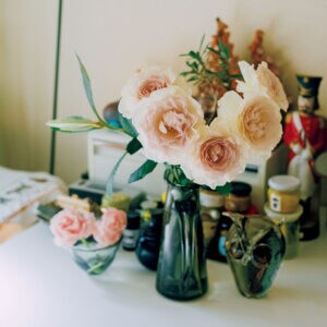 ひと際目を引いたのは、パリスという品種のピンクのバラ。「花を美しく見せてくれる」という首が細いグリーンの花器に飾られていたこともあって、ロゼット咲きのロマンチックさが際立っている。