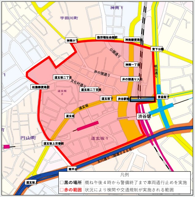 さらに渋谷駅周辺を中心に、道玄坂エリアなど広い範囲で、状況により検問や交通規制を実施するほか、電動キックボードシェアのLUUPも、渋谷区21か所のポートで期間中一時的に利用ができなくなる。