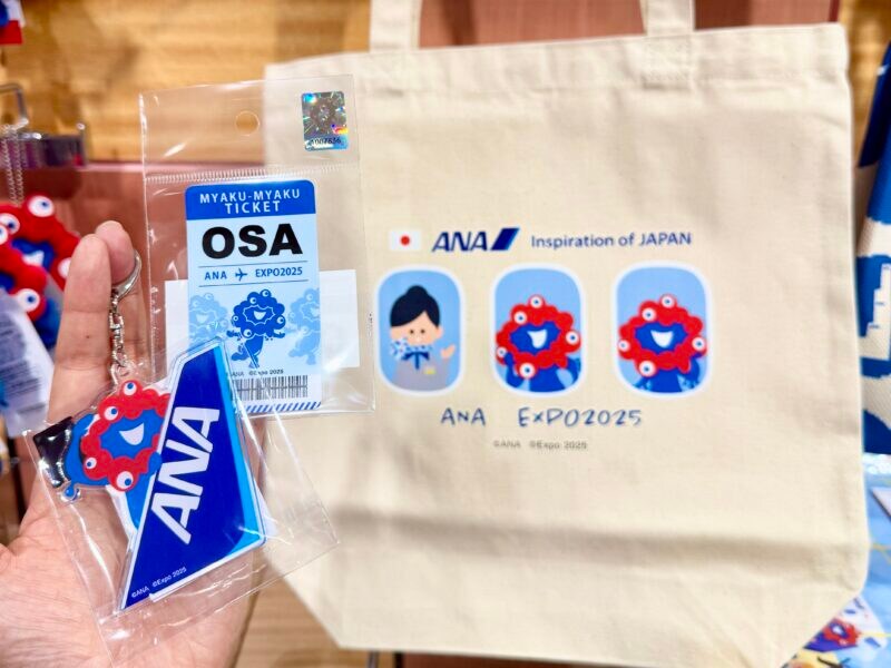 「最近入荷してきたのがこちらのコラボアイテムです」と広報さんにご紹介いただいたのが、ANAコラボ。個人的にはチケットデザインがツボ! キーホルダーもありました。