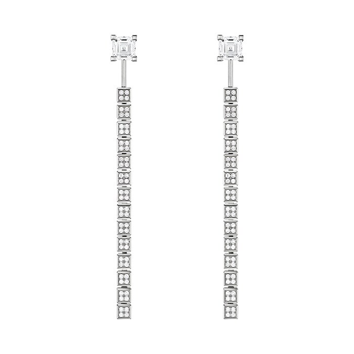 中でもひときわ目を奪われるのが、変形可能なステートメントネックレス。取り外し可能なチェーン構造がシーンに応じたスタイルを可能にし、ダイヤモンドと鏡面仕上げのキューブによって生まれる立体感がモダンな印象を与える。ブレスレットやピンもまた、高さの異なるキューブで都市のスカイラインを思わせる輝きを生み出す。さらに今回は、アールデコを想起させるアッシャーカットダイヤモンドを配したリングとピアスが登場。センターストーンとキューブの構築的なフォルムが呼応し、建築的な美学を際立たせる。