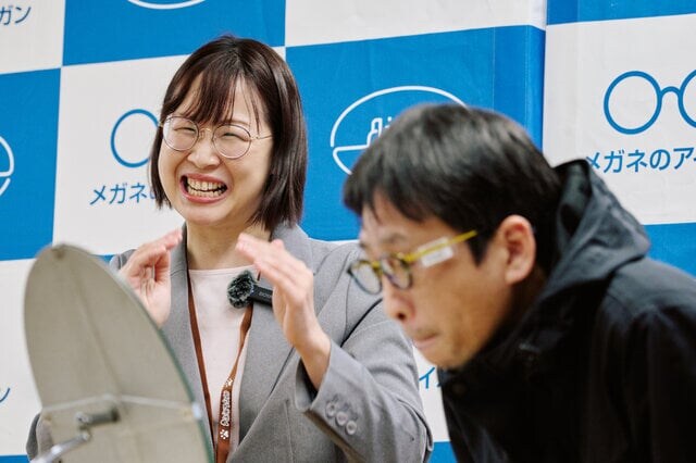 また、草野球の後に銭湯に行くのが好きというお客様役に対し、お風呂・サウナ専用メガネ「AIGAN FORゆⅡ(度付き)」を提案。サビに強いことや、くもりにくい仕様などを優しい笑顔で丁寧に説明していました。