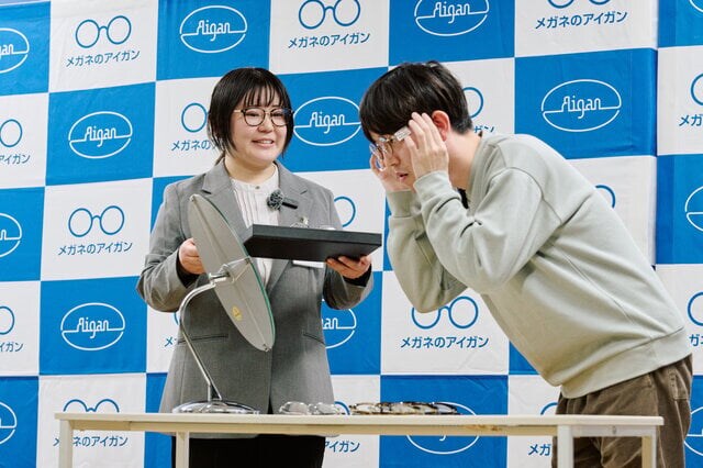 また、デートで黒のジャケットを着用したいというお客様役に、普段とは違ったカラーを提案。普段着用しないカラーの提案に驚きつつも、黒にあう優しげな雰囲気のカーキのメガネにお客様役も満足そうでした。最後の出番でしたが、とても落ち着いた接客を見せてくれました。