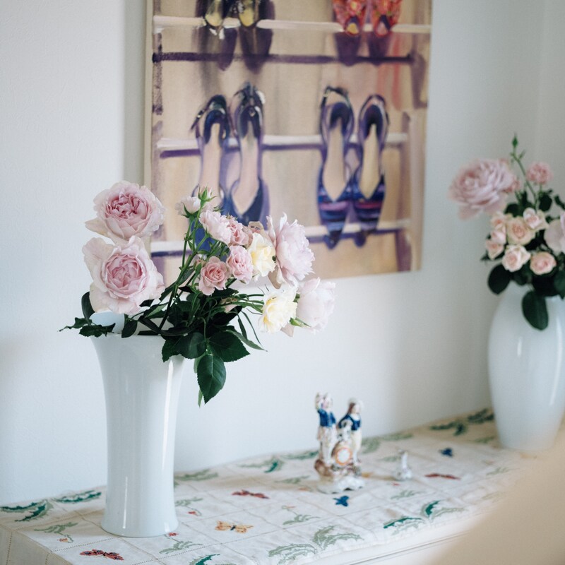 花をモチーフにしたペインティングで知られる佐藤翠さんの家は、一つの部屋の中でも花が複数箇所に飾られている。360度あらゆる場所にある印象だ。 もともとはそれほど花に興味を持っていなかったが、20代後半にロンドンに滞在した際、住んでいたアパートの隣に咲いていたライラックを眺めているうちに、花弁一つ一つが繊細なジュエリーのような美しい造形をしていることに気づく。そこから花の魅力に惹かれていったそう。 花を飾ると、見慣れた部屋も新鮮に感じ、気持ちまでエレガントに彩られていく。玄関、キッチン、リビング、ベッドルーム、お気に入りの棚の上……、日々の暮らしに花が欠かせない画家・佐藤翠さんに、飾り方のヒ …