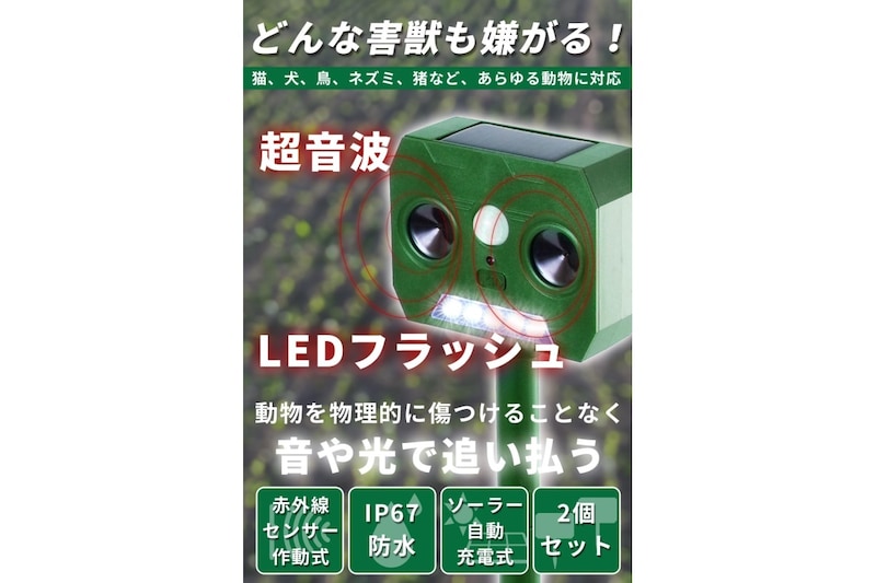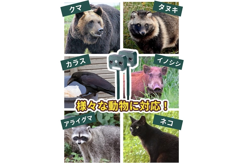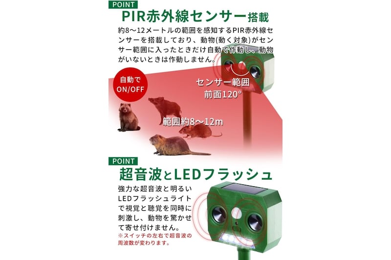 超音波とLEDフラッシュを組み合わせて、クマやイノシシ、タヌキ、キツネ、ネズミ、猫など、さまざまな動物の接近を感知すると自動で音と光を発して撃退します。