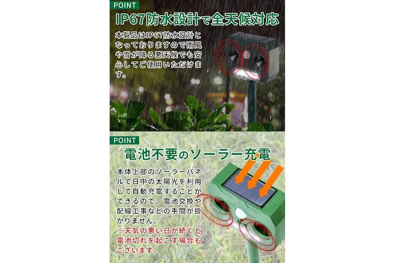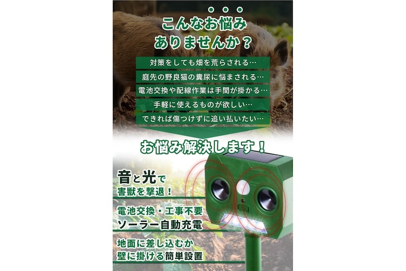 ソーラー駆動で環境にもやさしく、電源のない場所でも手軽に使える野生動物対策グッズです。