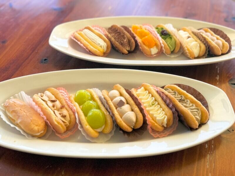 手前のお皿の一番左が、定番の生かげろう。このほか、旬のフルーツなどを使った「季節の生かげろう」が用意されています。それぞれ違う味を6本ずつセットにしたメニューが人気! ボリューミーに見えますが、普通のかげろうよりさらに口どけがよく、ひとりでひと皿食べられてしまう軽さです。
