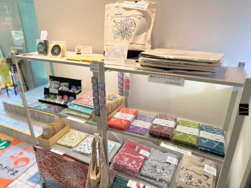 私が前回訪れたときにはごくわずかだった熊楠グッズが、今回訪れたらバリエーション豊富になっていました。嬉しい。猫のちょぼろくバッグなど色々買い込みました。