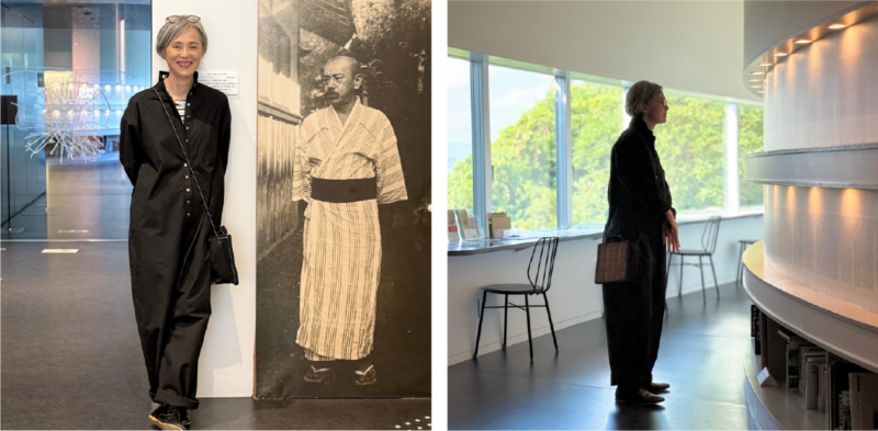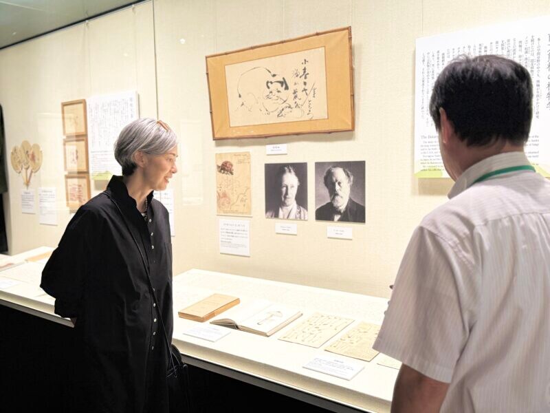 写真右:沙織里さんが眺めているのは、8mに及ぶ熊楠の手紙。内容は、熊楠の履歴書です。熊楠は手紙魔で、生涯を通じて多くの著名人と書簡を交わしています。『遠野物語』などで知られる日本民俗学の父・柳田國男は熊楠を「日本人の可能性の極限」と評しています。