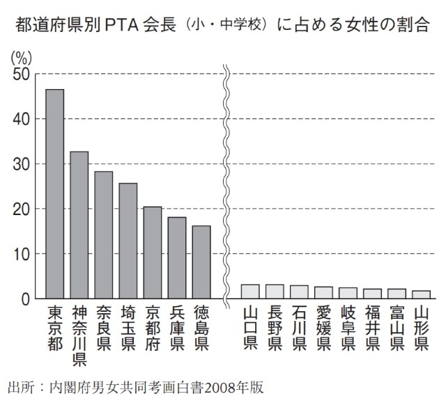 調べてみると、その印象を裏付けるデータがあった。内閣府の『男女共同参画白書(平成21年版)』は、小・中学校のPTA会長に占める女性の割合を都道府県別にまとめている。