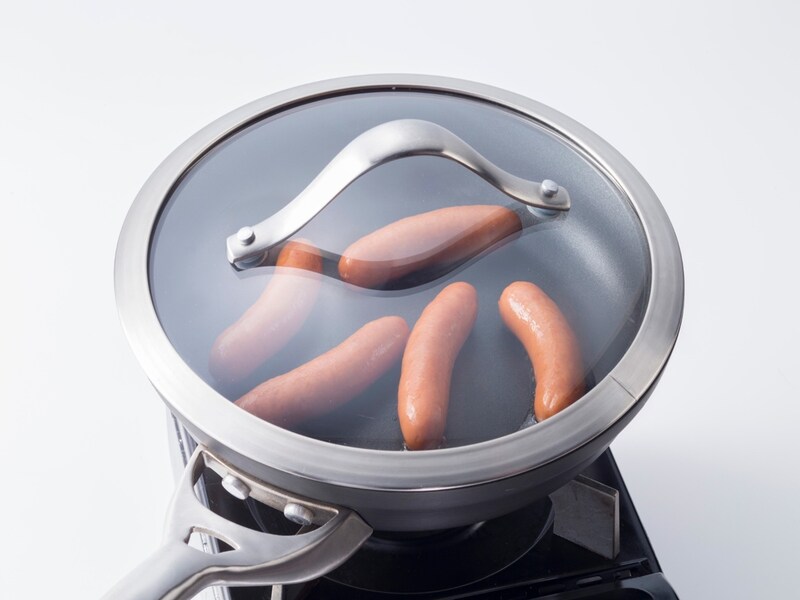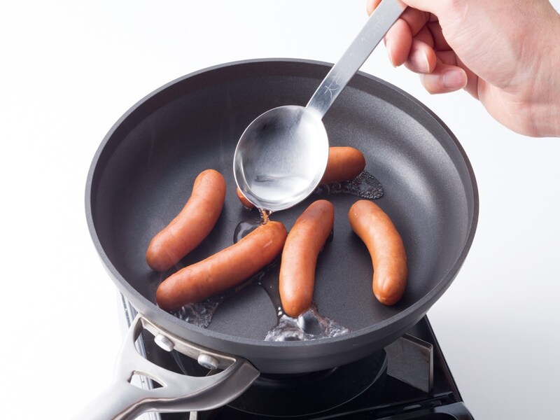 3.フタを取り、残った水分がなくなるまでウインナーを転がしながら焼きます。表面にツヤが出てきて、軽く焼き色がついたら完成。
