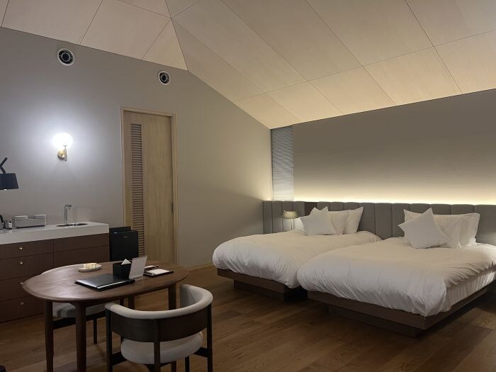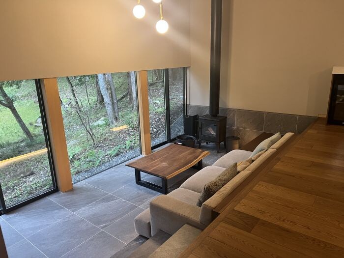 東京から2時間足らずでアクセスできる箱根・仙石原に広がる15000坪の森が静かに、優しく出迎えてくれる。「före(フォーレ)」のホテル棟、18棟のプライベートヴィラ「villa 1/f(ヴィラ ワンバイエフ」、料亭、レストラン、カフェラウンジ、温泉・スパ施設などはすべて敷地内にそろう。今回は2024年8月に新たに建てられた温泉スイート「いぶき」へ。斜面地に立つ15号棟は、木目が温かくモダンな北欧風のヴィラ。暖炉、ソファーのリビングスペースが1段下がった場所にレイアウトされており、窓一面に広がる自然の表情に癒やされる。