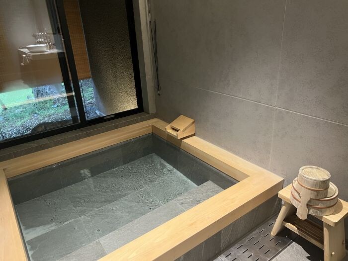 日本ならではの究極のリトリート体験といえば温泉。全棟で強羅から引いた温泉を24時間好きなときに楽しめるのが「villa 1/f」の最大の魅力のひとつ。ゆっくりと湯に浸かって体を温めると、日頃の体の疲れがとれて心が満たされてゆく。半身浴で読書をしてみたり、好きなドリンクをお供にしたり、寝る前に少しだけ足湯をしたり。ヴィラの宿泊者はföre棟の大浴場「Onsen f」も利用できるが、このプライベート感に勝るぜいたくはないように感じられた。