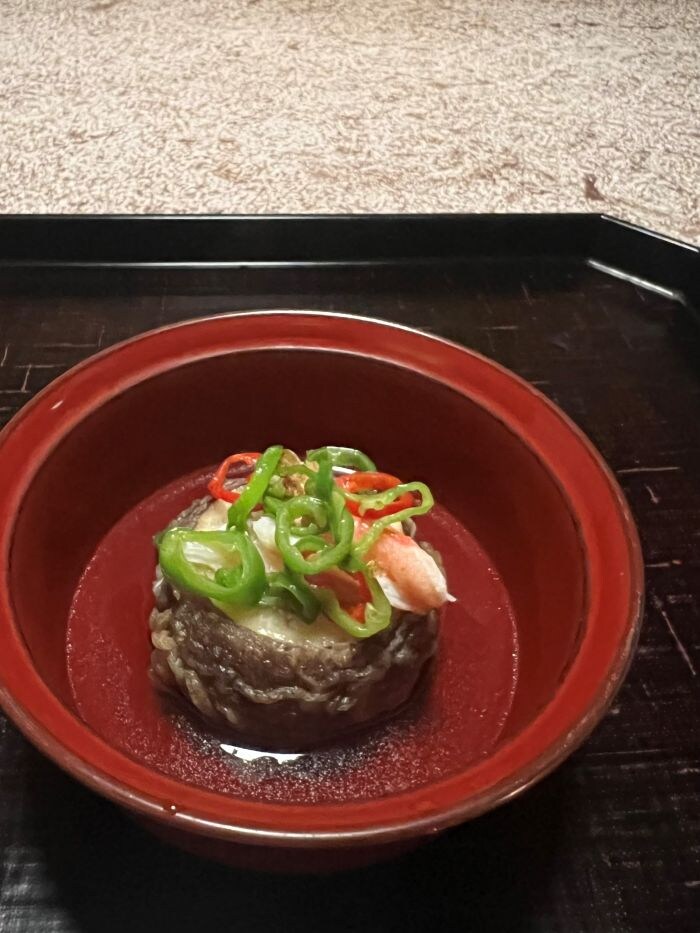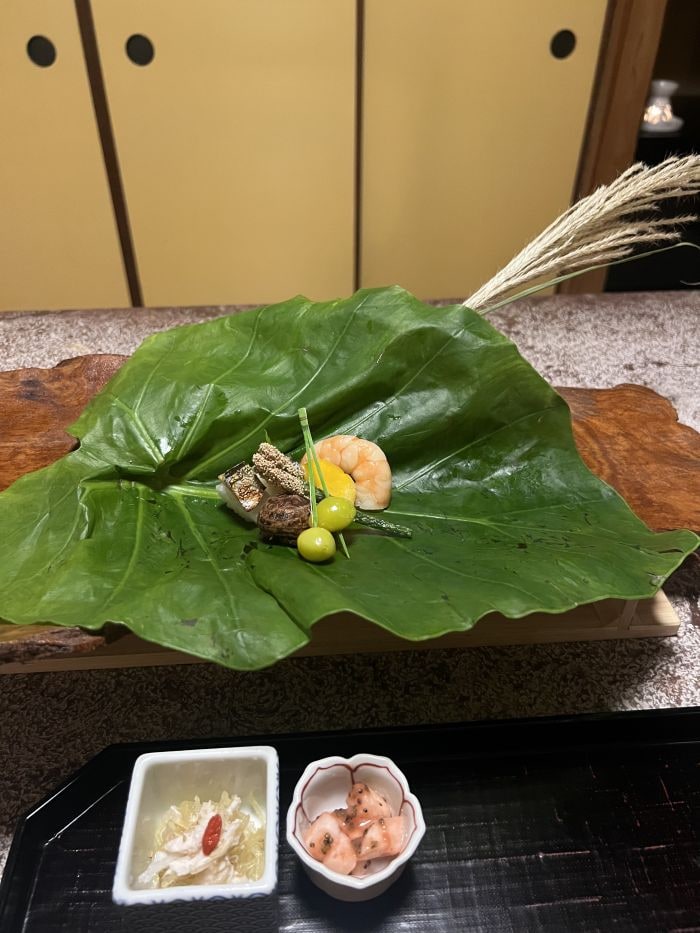 自然の中で地元の新鮮な食材を使った食事を味わうことも、心身を満たすリトリート体験のひとつ。敷地内にたたずむ歴史的にも貴重な元名門旅館、「俵石閣」を改装した料亭「俵石(ひょうせき)」で本格懐石をいただいた。前菜には満月に見立てた帆立の黄身焼き、煮物椀では松茸(まつたけ)と鱧(はも)の饗宴など旬の食材で、彩りや盛り付けでも季節を感じられる逸品を満喫。