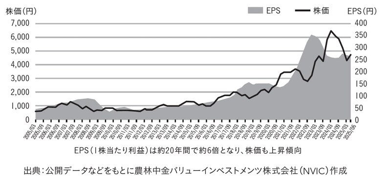 結果として図表3で示すように、同社株価は同期間において8.4倍(配当込み)になっていますが、そのリターンはPERの揺れ動きというよりもEPSの増大によることがわかります。ちなみに同期間(2005年〜2025年)のインデックス(TOPIX)の上昇は3.7倍(配当込み)にとどまっています。