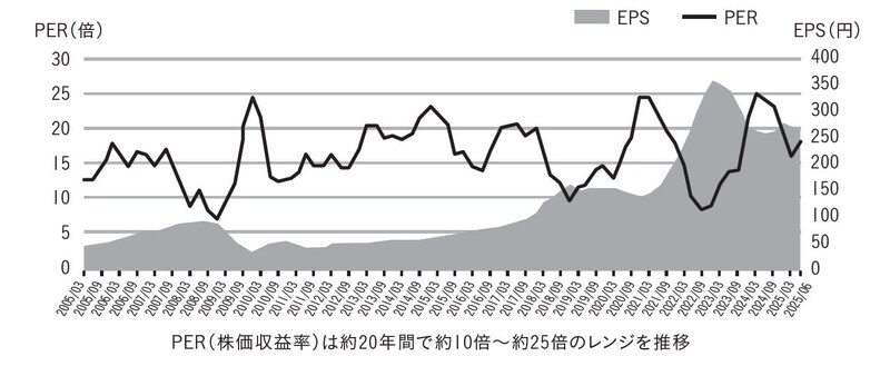図表2の折れ線グラフ(左軸)が同社の長期的なPERの推移を表します。大きく揺れ動いていますが、長期的には10倍弱から20倍強のレンジ内に収まっていることがわかります。一方、同じグラフの面グラフ(右軸)が同社の長期的なEPSの増大で、デコボコはあるものの、趨勢(すうせい)的に増大しており、この期間において6倍になっていることがわかるでしょう。
