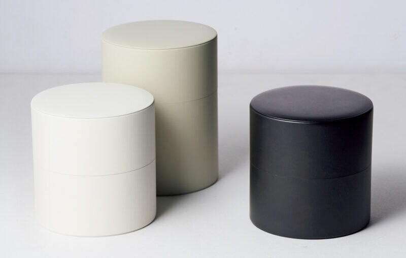 (右から)ティン キャディーS[高さ9.5×直径9.5㎝](黒と白) 各¥4,620、M[ 高さ12.5×直径9.5㎝) ] ¥4,950/すべてモへイム