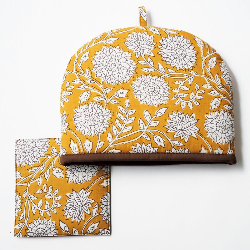 インドのブロクックプリントの布を使った、やさしい曲線の花柄が印象的なティーコジーとマット。エキゾチックな雰囲気が紅茶時間を彩ります。