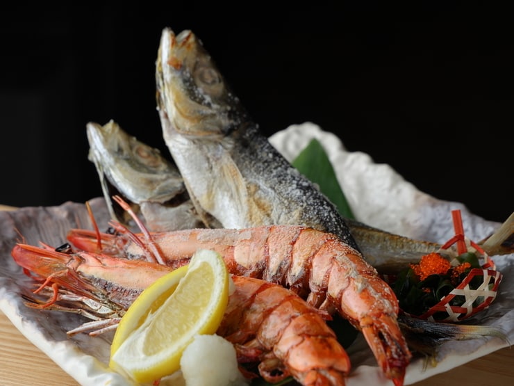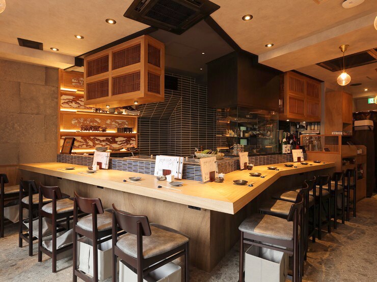 和モダンテイストでまとめた店内は、リラックスできる落ち着いた雰囲気。旬魚を焼き上げる様子などが間近に見られるカウンター席は、ライブ感たっぷりの特等席です。テーブル席のほか、半個室もあり、ビジネスシーンにも使えます。飲み放題付きのコースがあるので、宴会などの利用にもぴったり。プチ贅沢気分が味わえるお店です。
