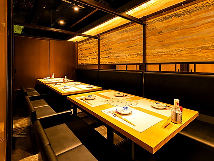 温かみのある照明が優しく照らす店内は、和風のデザインで落ち着いた雰囲気。広々としていて、ゆったりくつろげます。テーブル席のほか、2名~の大小さまざまな個室を完備。人数やシーンに合わせて利用できます。飲み放題付きのコースもあり、懇親会や同窓会など各種宴会にも対応。“遊べる酒場”で、楽しいひとときを過ごしてみませんか。